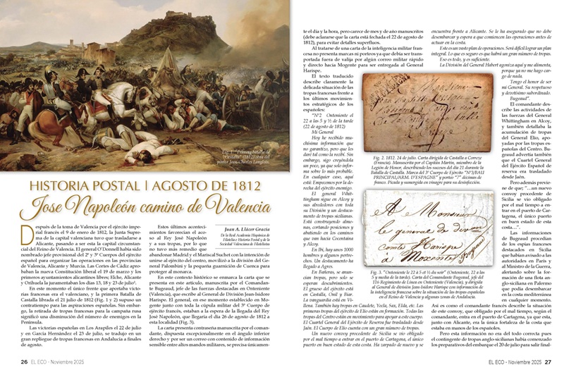 En este número, además, cuatro interesantes artículos de filatelia. La serie de artículos “Precursores” de David González Corchado, miembro de la Real Academia Hispánica de Filatelia e Historia Postal, presenta la segunda parte del tema “Alternativas al Correo Oficial” dedicado a “Las Redes Mercantiles como Sistema de Comunicación”. Juan A. Llácer Gracia, miembro de la Real Academia Hispánica de Filatelia e Historia Postal y de la Sociedad Valenciana de Filatelistas, presenta su trabajo sobre historia postal en un artículo titulado “Agosto de 1812: José Napoleón camino de Valencia”. Marcelino González, miembro de la Sociedad Filatélica de Madrid, se encarga de recordarnos que San Agustín, ciudad norteamericana situada en La Florida, fue fundada en 1565 por Pedro Menéndez de Avilés – hace 460 años -, y hoy es la ciudad de origen europeo más antigua de los Estados Unidos. en su artículo “Pedro Menéndez de Avilés y San Agustín de la Florida”. Finalmente, Alejandro Abadía París, miembro de la Real Academia Hispánica de Filatelia e Historia Postal y del Grupo Filatélico de Samper de Calanda, con motivo de los 117 años de Turismo en Aragón y el recuerdo del primer congreso filatélico celebrado en Zaragoza en 1908, nos habla de “El Turismo Aragonés en la Filatelia”.
