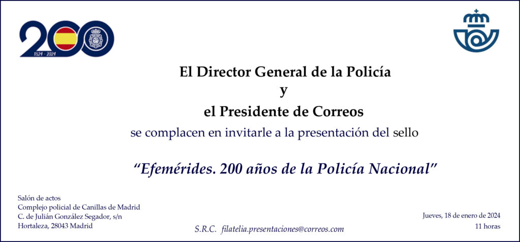 Nos complace invitarle a la presentación del sello ”Efemérides. 200 aniversario de la Policía Nacional”, que se celebrará el próximo jueves 18 de enero en Madrid.